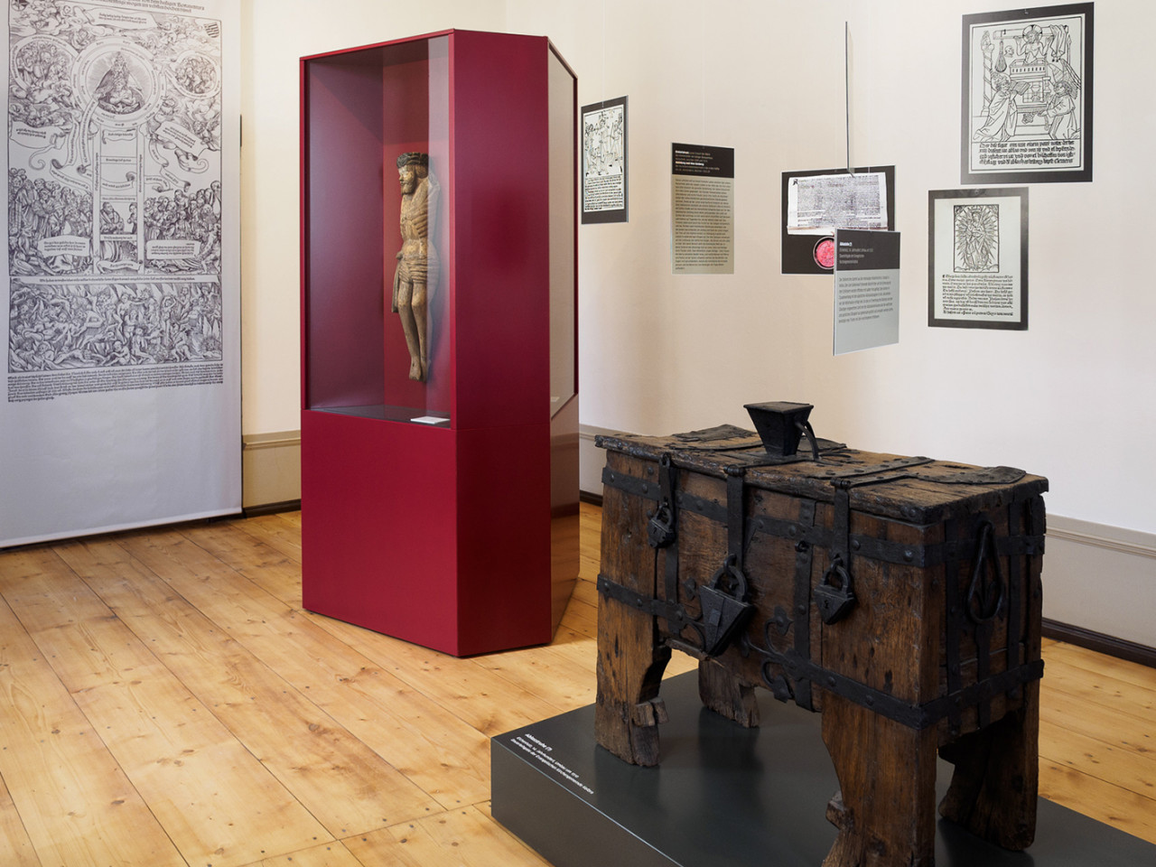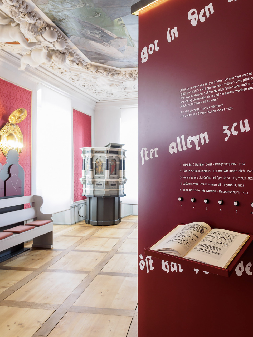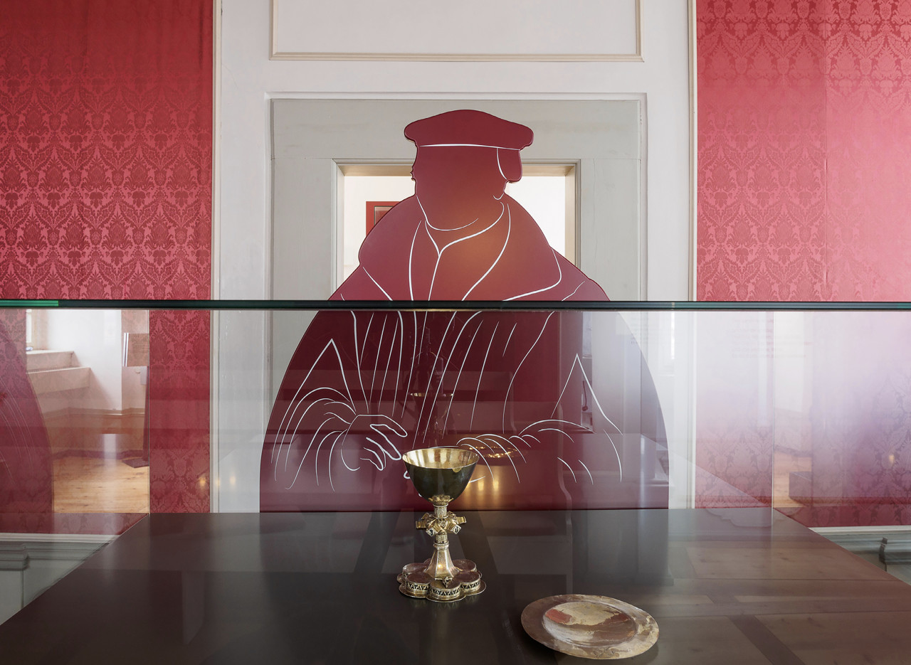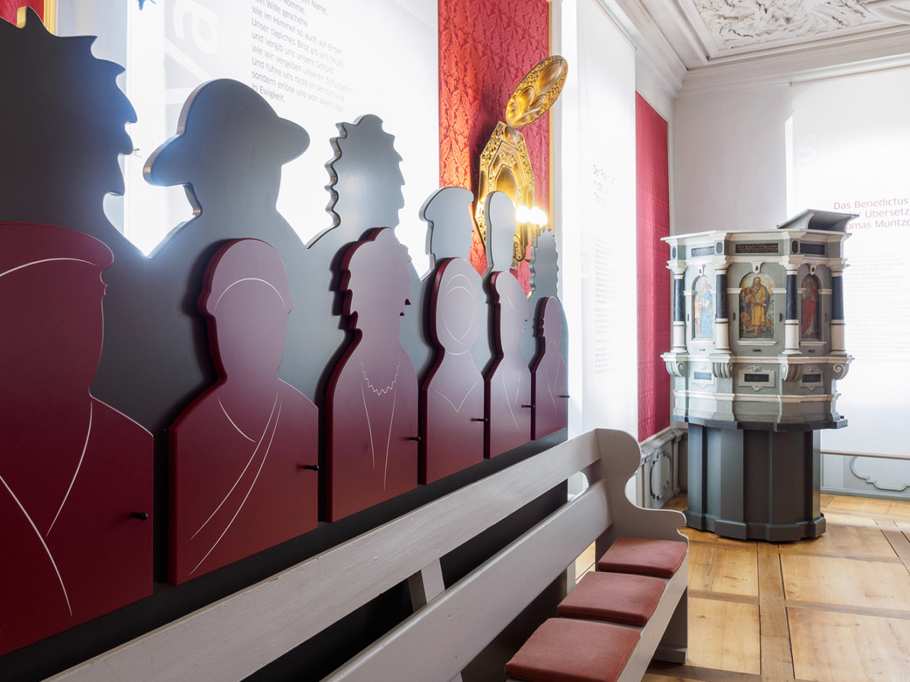 Die Radikalität von Müntzers Thesen spiegelt sich in der Ausstellungsarchitektur. Kraftvolle rote und graue Flächen, plakative Darstellungen prallen auf historische Räume der Kernburg.