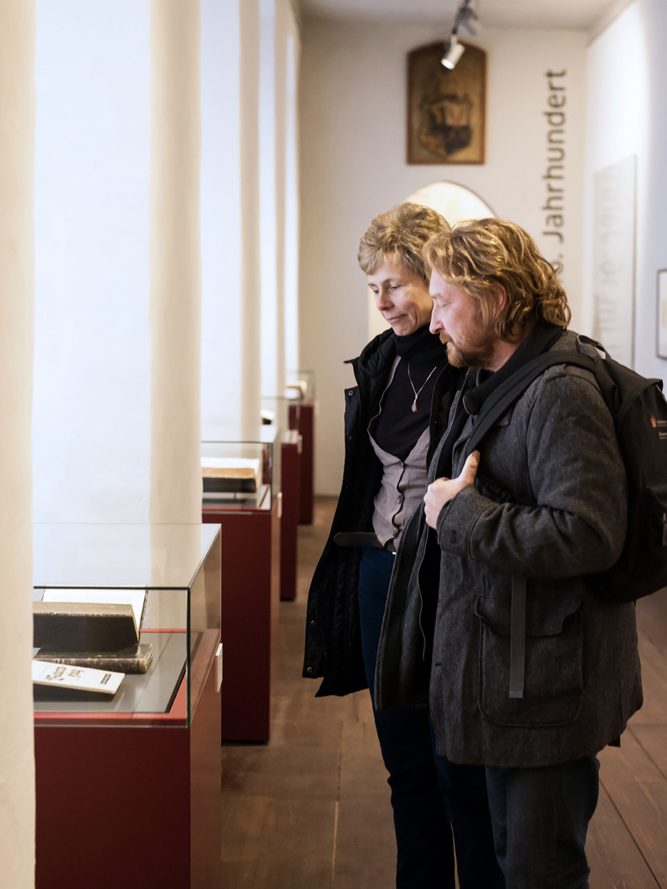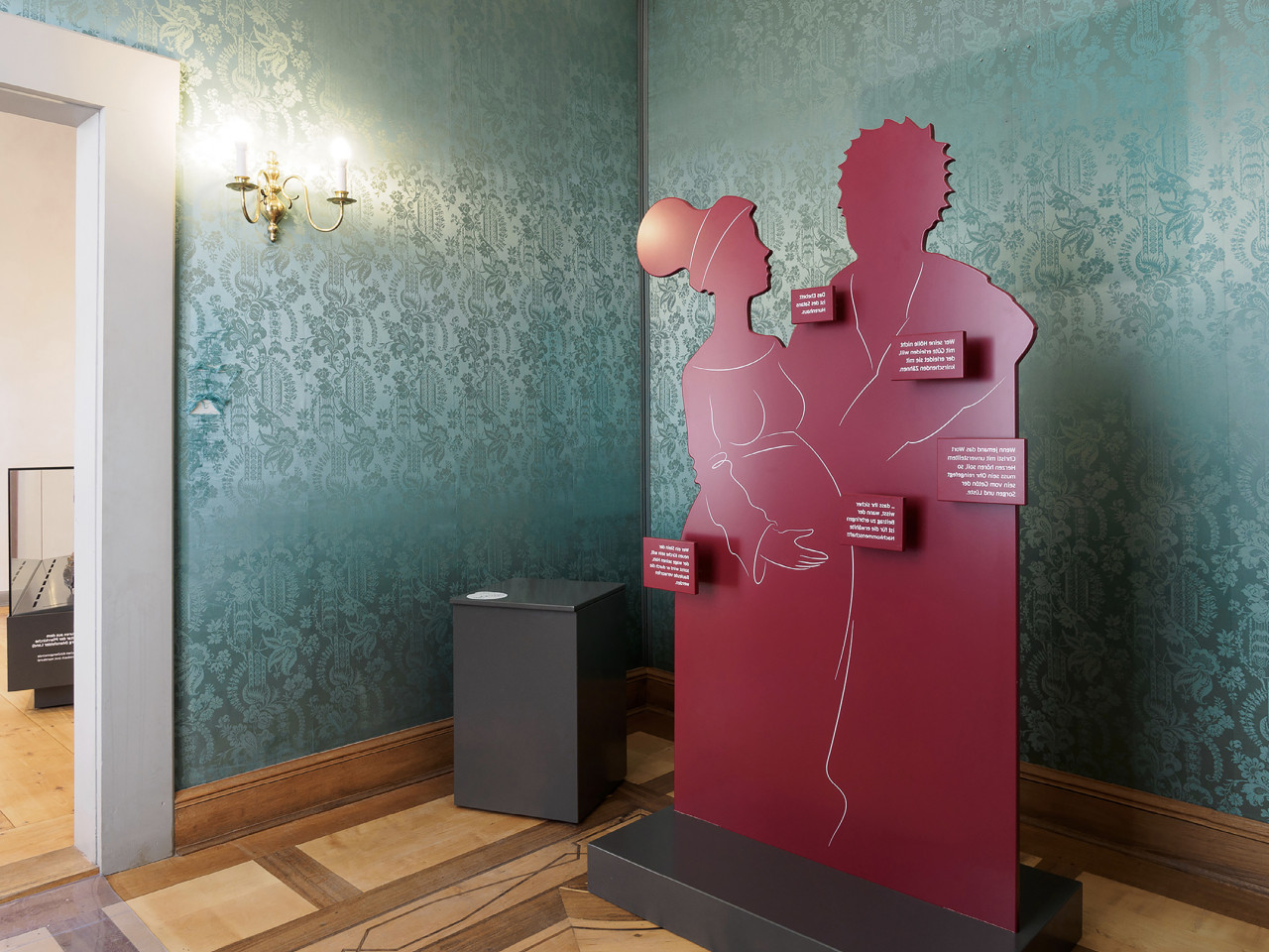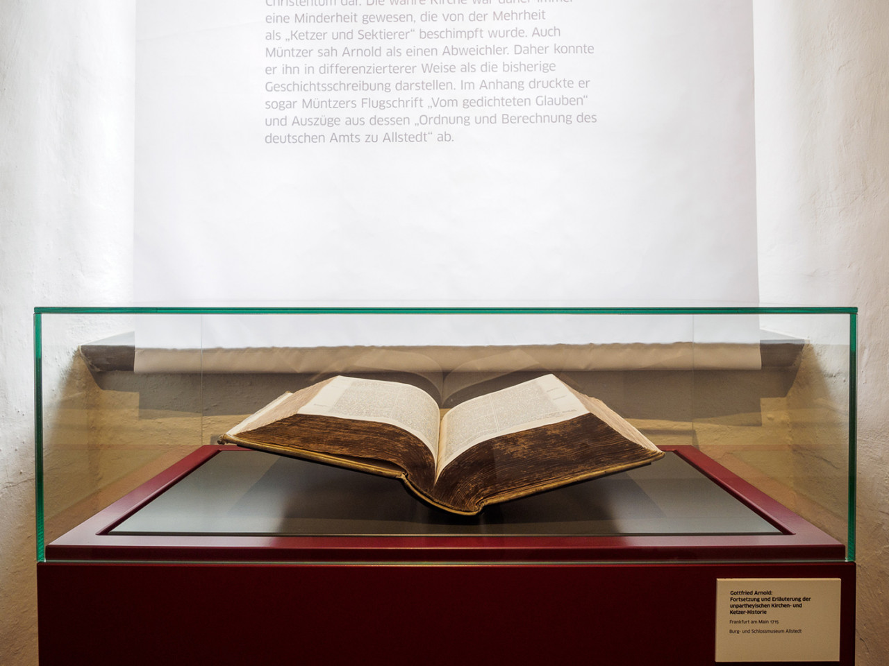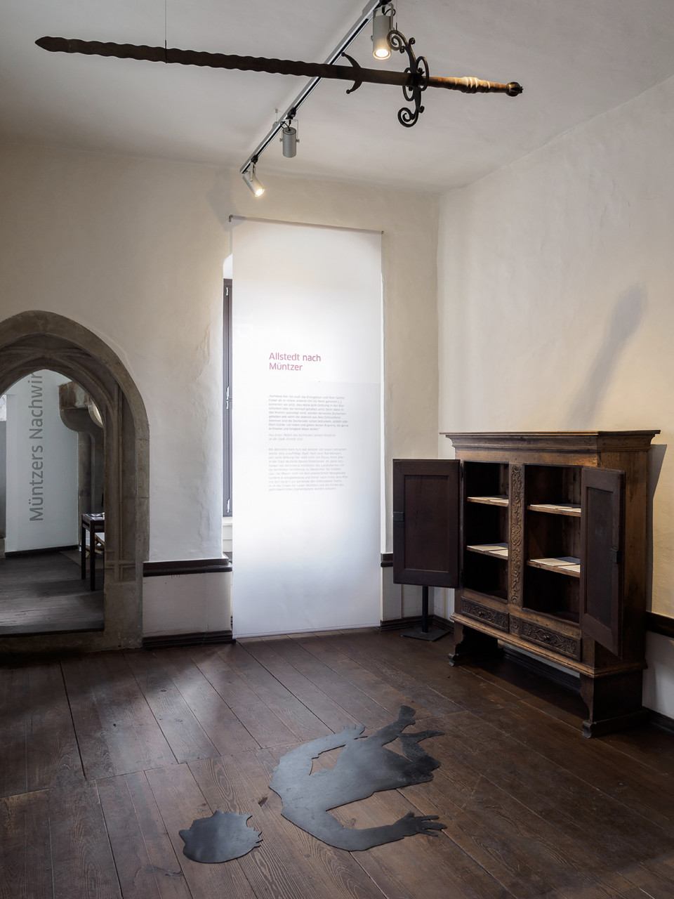 Die Radikalität von Müntzers Thesen spiegelt sich in der Ausstellungsarchitektur. Kraftvolle rote und graue Flächen, plakative Darstellungen prallen auf historische Räume der Kernburg.