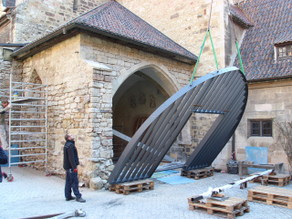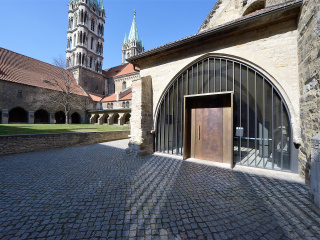 Eigenständig und selbstbewusst fügt sich das von unserem Büro entworfene Portal in die historische Öffnung der Vorhalle des Naumburger Domes. Der neue Besuchereingang aus Baubronze wird von einem Stahl-Glasgerüst gehalten. Mit dem Einbau konnte Barrierefreiheit in die Vorhalle und den Kreuzgang realisiert werden.